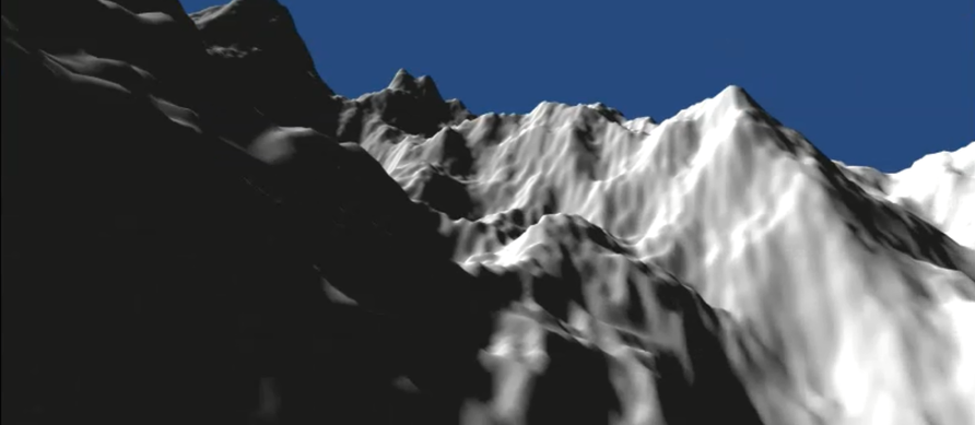 Lighting on the terrain is per-face lighting, which creates the look of a jagged gemstone-like surface. A smoother terrain could be made using a normal map. Normals are currently calculated per-face using the geometry shader.